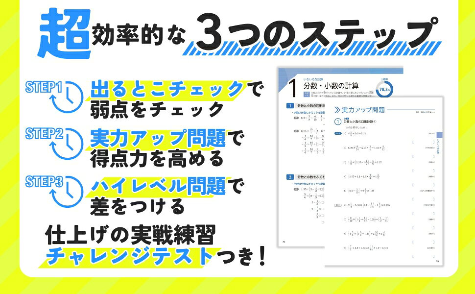 単元ごとに「出るとこチェック」⇒「実力アップ問題」⇒「ハイレベル問題」の3ステップで効率的に入試対策が行えます。また、仕上げの実戦練習ができる「チャレンジテスト」もついています。