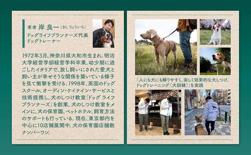 ドッグライフプランナーズ代表。ドッグトレーナー。1972年3月、神奈川県大和市生まれ。明治大学経営学部経営学科卒業。幼少期に過ごしたイタリアで、放し飼いにされた愛犬と飼い主が幸せそうな関係を築いている様子を見て衝撃を受ける。1998年、英国のドッグスクール、オーディン・ケイナイン・サービスと技術提携し、犬のしつけ教室「ドッグライフプランナーズ」を創業。しつけ教室をメインに、犬の保育園、ペットホテル、飼育方法のサポートも行っている。モットーは「犬には優しく、オーナーには厳しく」。現在、東京都内を中心に、10店舗展開中。ドッグライフプランナー協会会長として、正しい犬の知識、犬の育成環境の向上、保護活動なと、犬も人も幸せに暮らせる社会の実現に尽力している(本データはこの書籍が刊行された当時に掲載されていたものです)