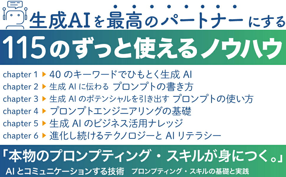 prologue 生成AIの現在地図/1 40のキーワードでひもとく生成AI/2 生成AIに伝わるプロンプトの書き方/3 生成AIのポテンシャルを引き出すプロンプトの使い方/4 プロンプトエンジニアリングの基礎/5 生成AIのビジネス活用ナレッジ/6 進化し続けるテクノロジーとAIリテラシー