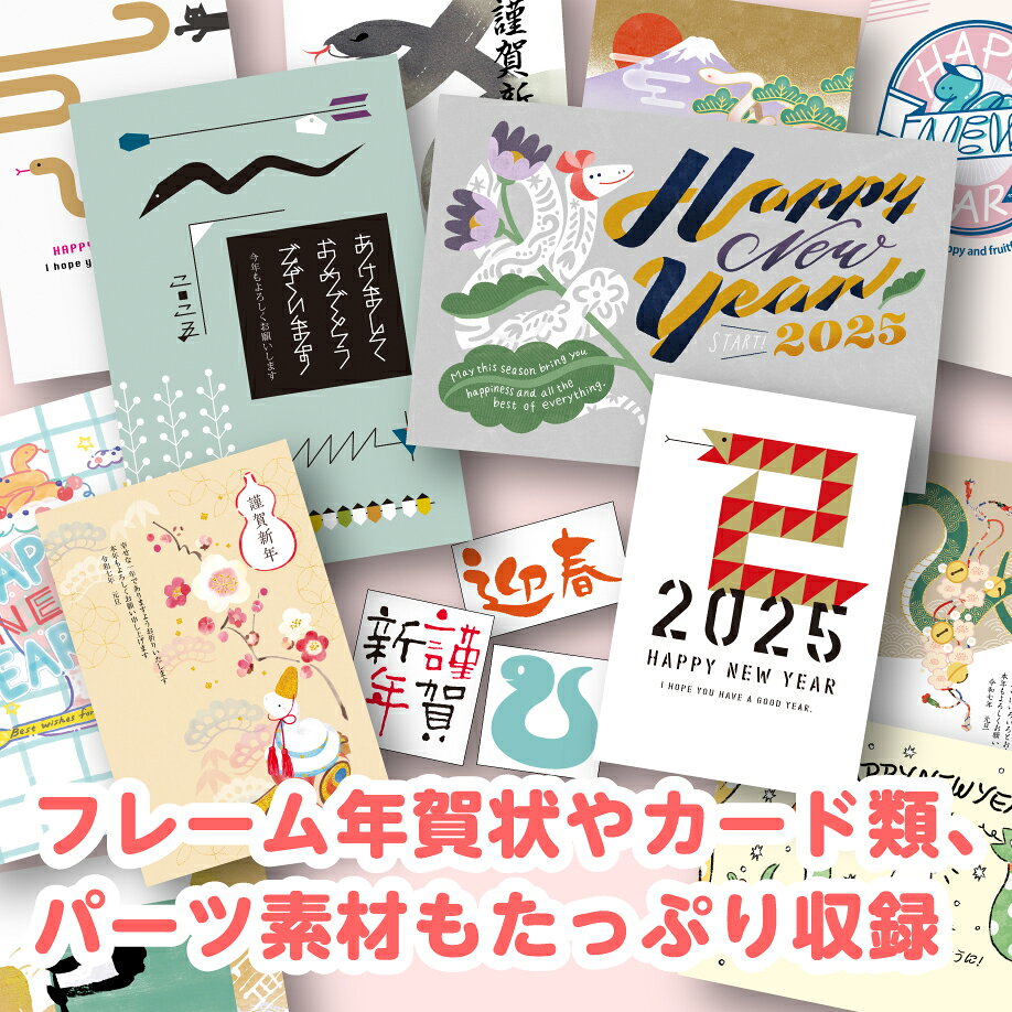 写真フレーム年賀状や、フォーマル年賀状、グリーティングカード、パーツ素材も多数収録!