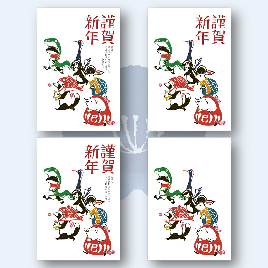 1「完成ハガキ」2「年号なしハガキ」3「年号・文言なしハガキ」「イラストのみハガキ」の4パターンを収録しています。