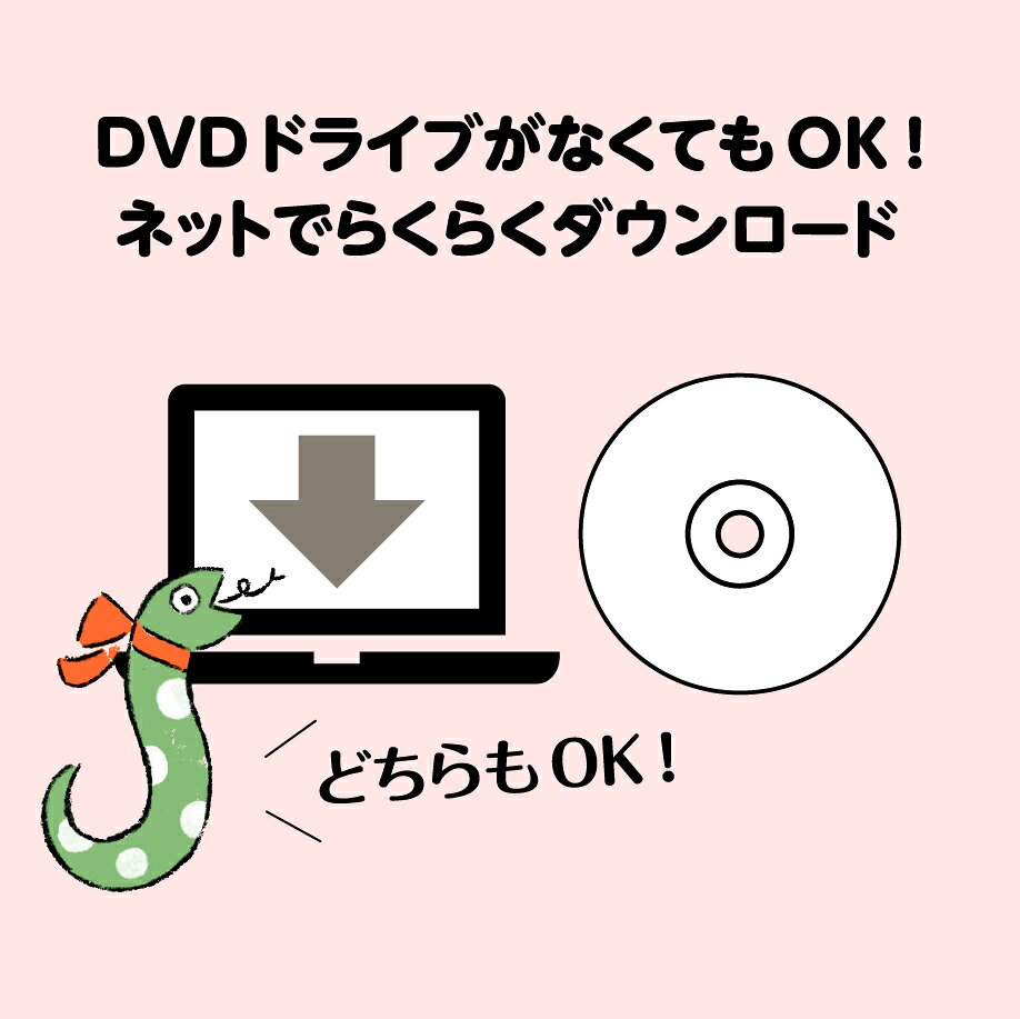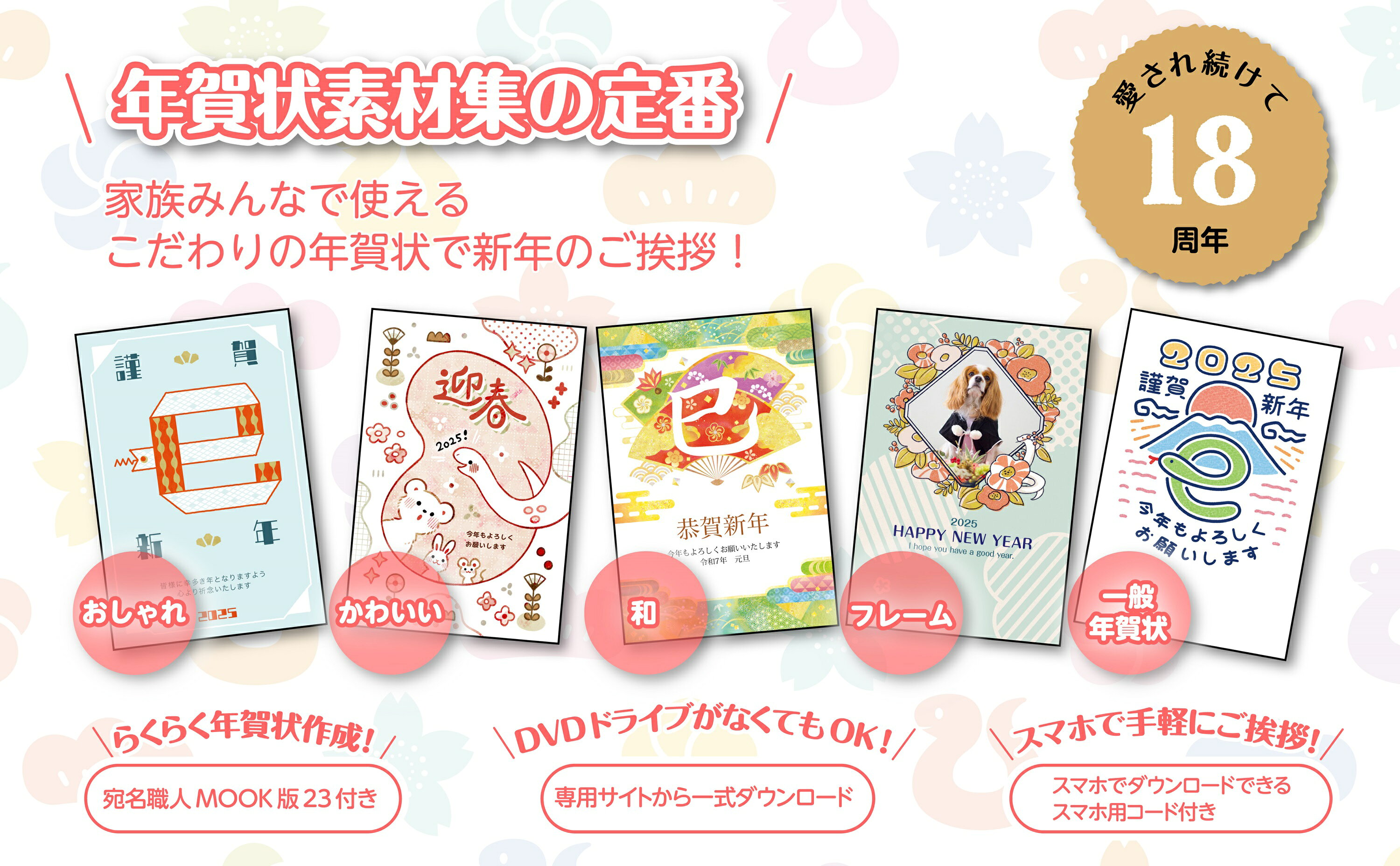 年賀状デザインと宛名職人が入ったDVD-ROM付き。DVDドライブがない場合には、専用サイトからダウンロードできます!
