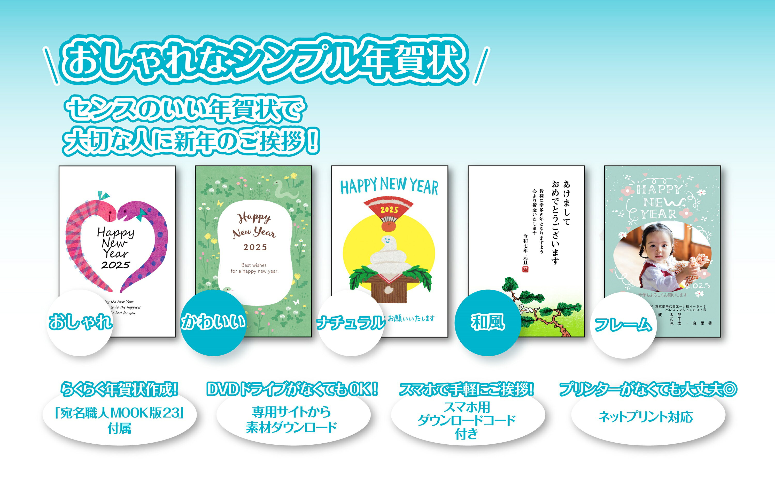 これ1冊で、年賀状のデザインを決めるところから印刷までワンストップで完成できます!