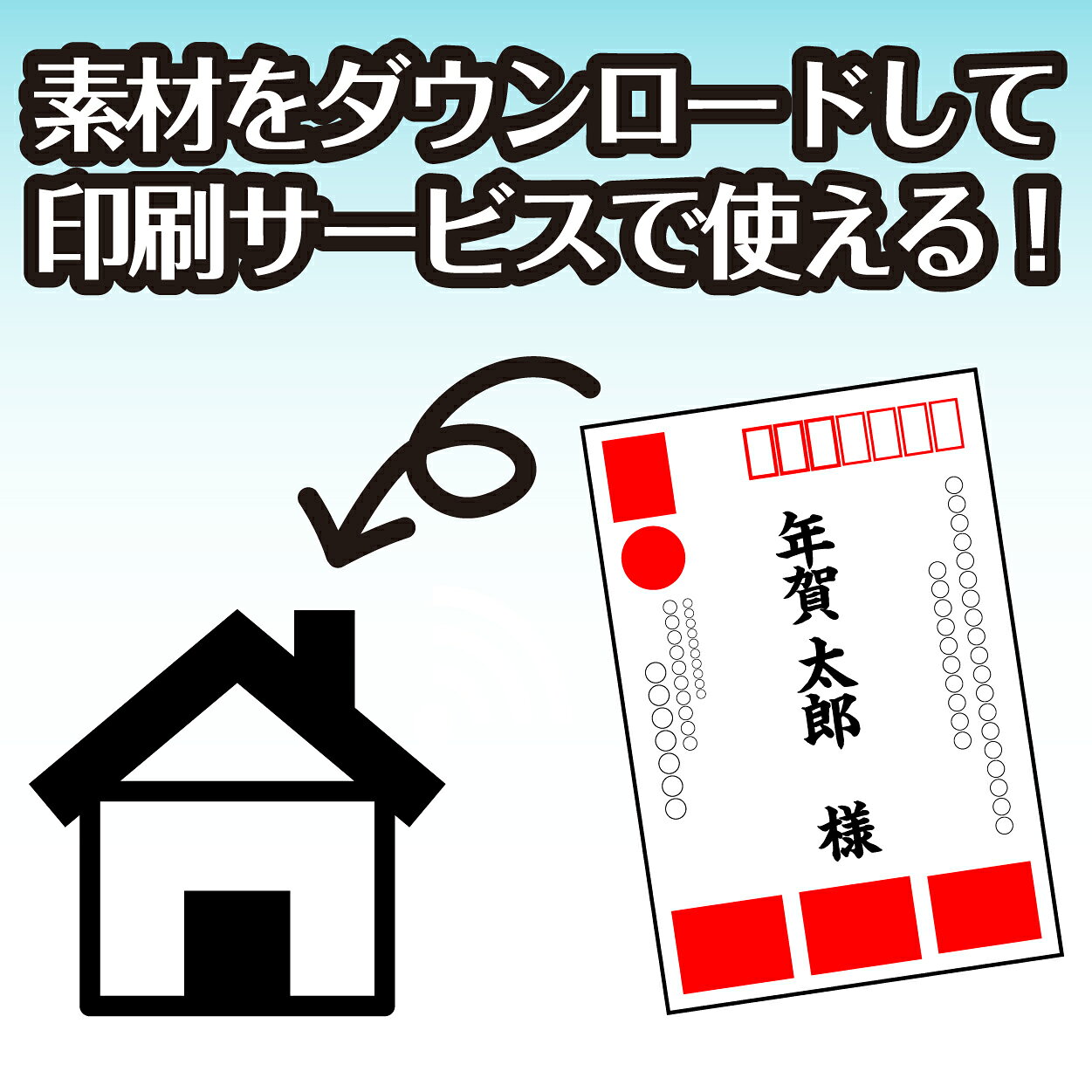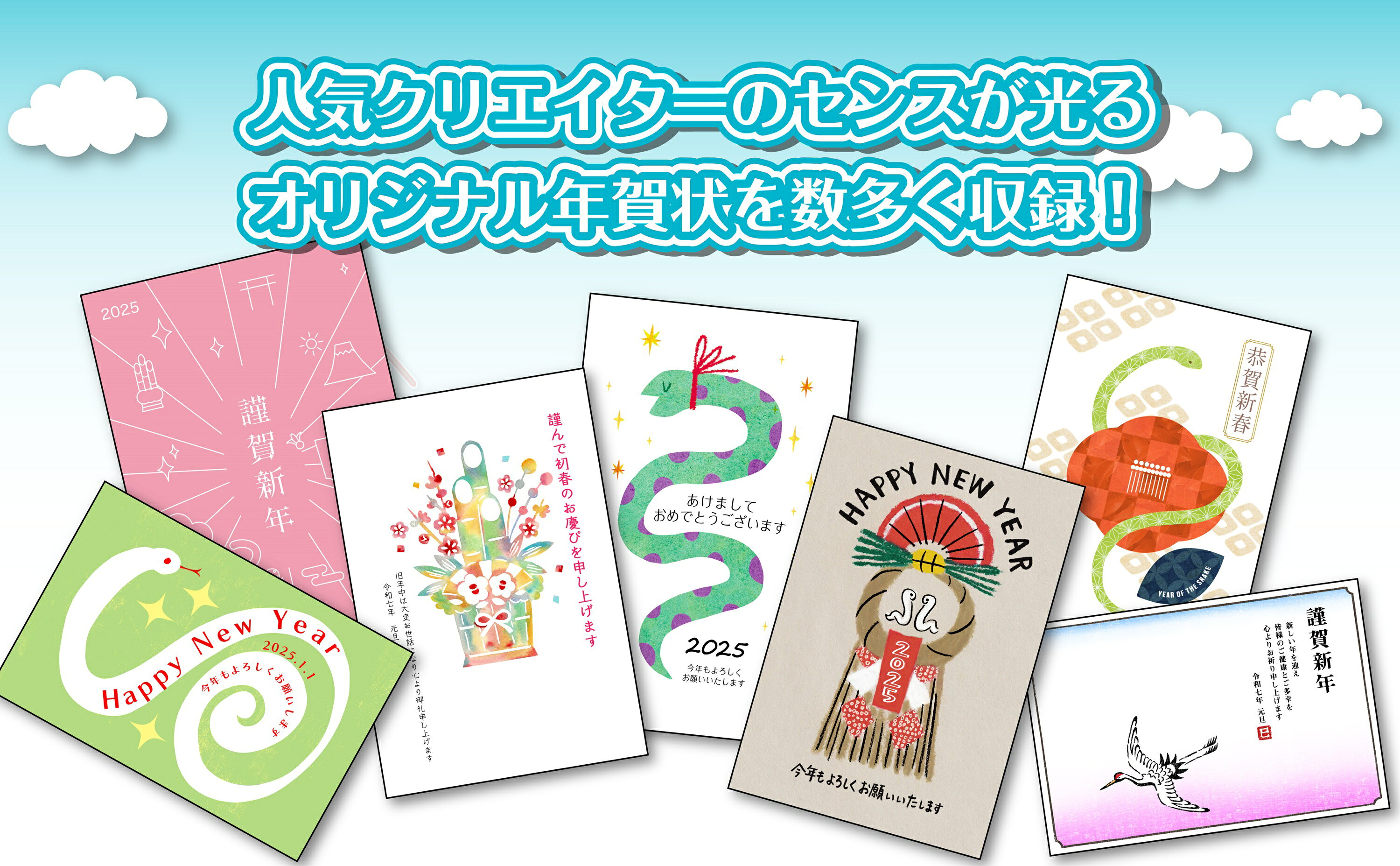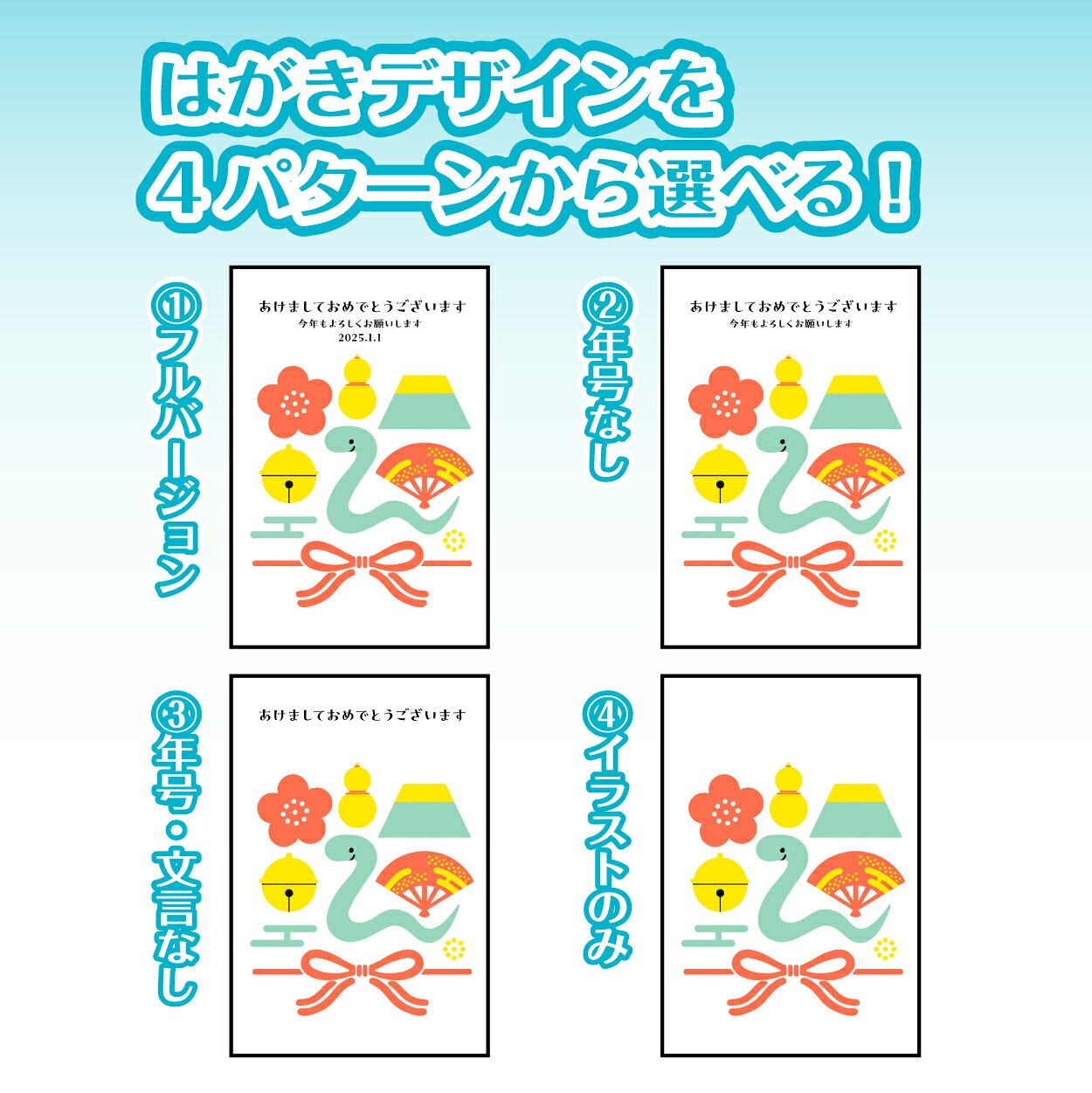 そのまま使える「完成ハガキ」、「年号なし」、「年号・あいさつ文なし」、賀詞やあいさつ文、年号などを自由に入れられる「イラストのみ」の4パターンを収録。シーンに合わせて使い分けられます。