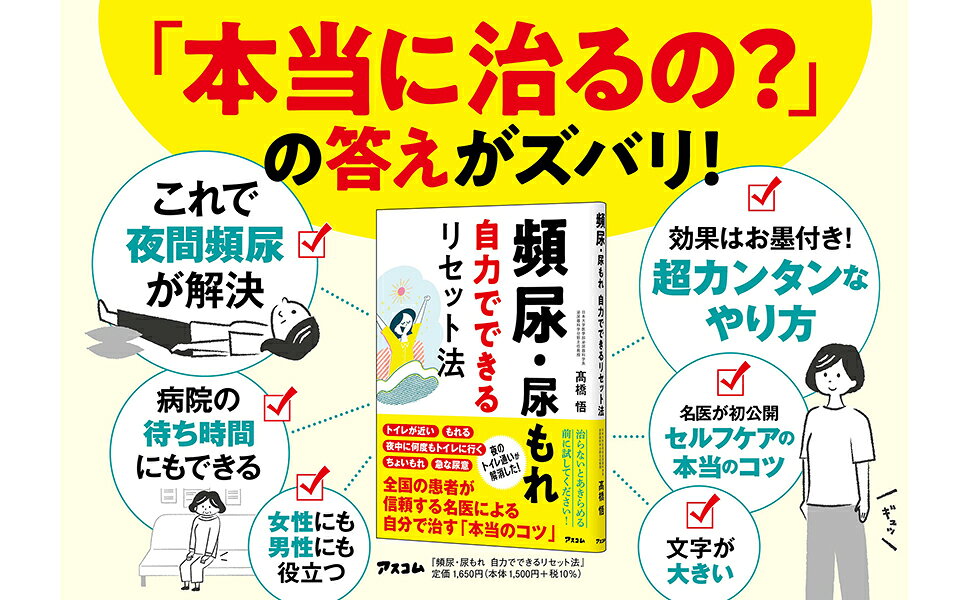 トイレが近い、もれる、夜中に何度もトイレに行く、ちょいもれ、急な尿意。全国の患者が信頼する名医による自分で治す「本当のコツ」。治らないとあきらめる前に試してください!夜のトイレ通いが解消した!
