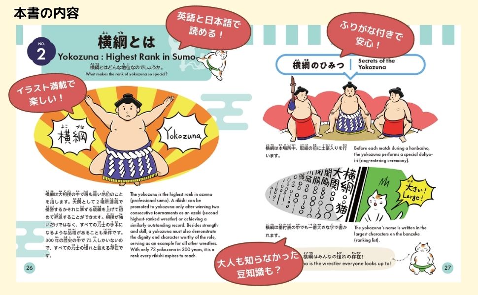小学校でも英語の授業が始まり、教室でもグローバル化が進む中、日本の文化について外国の方と話したり外国語で紹介したりする機会も増えているかもしれません。そこで本書では、日本の伝統スポーツとして親しまれている「相撲」について、日本語と英語の二言語で紹介します。相撲の面白さや豆知識、楽しみ方について日本語でも英語でもやさしく理解できる1冊です。