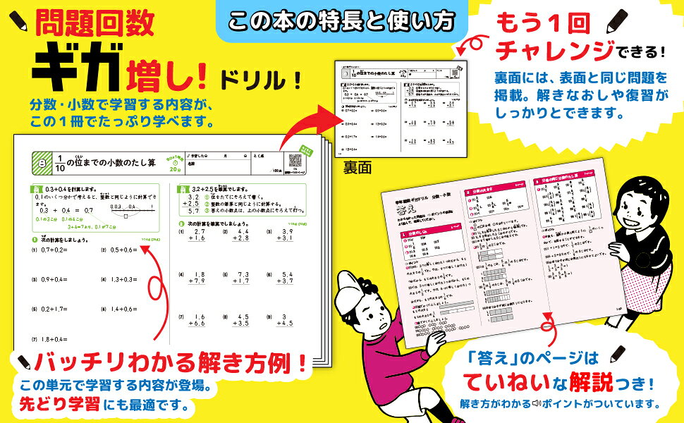 小学3〜6年生の分数・小数で学習する内容をギュッと凝縮!学年にとらわれず一気に復習することはもちろん、先どり学習にもピッタリの1冊です。