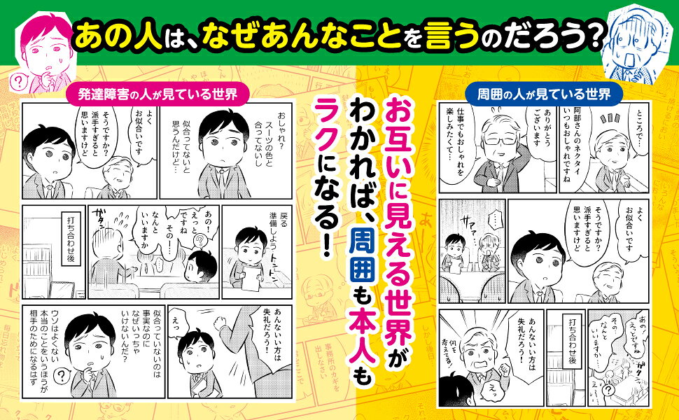 発達障害当事者の見え方と周囲の人の見え方をマンガで比較し、それぞれの見え方の違いを紹介。互いに見える世界がわかれば、周囲の人も本人も、学校生活・仕事・人間関係がらくになります!