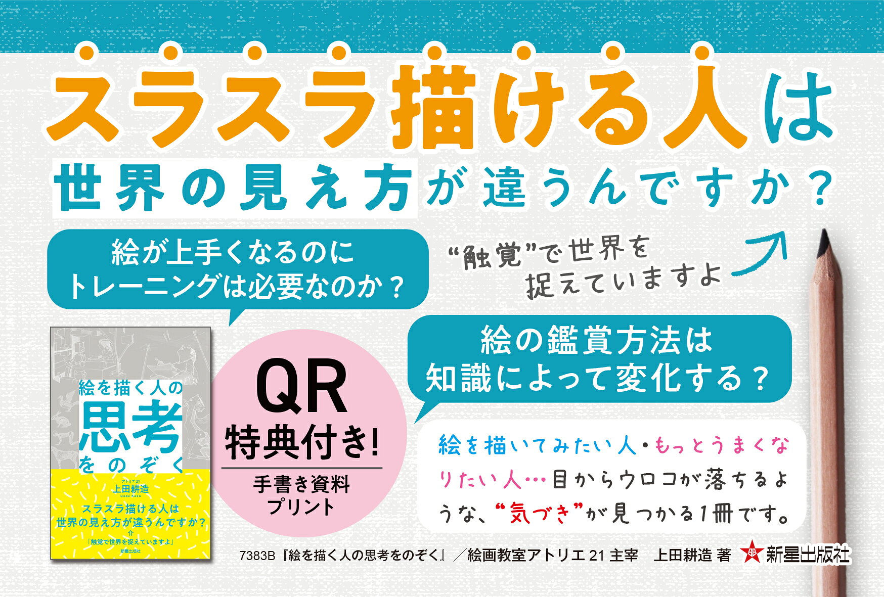 「世界の見え方」が、これまでと変わるかもしれません。なぜヒトは絵に興味を持つのか。ものの見え方はひとりひとり違っている。自然物には球体にまとまろうとする意志がある。色にも一生がある。見えない部分をとらえるのがデッサン力。「美術史」は「人類の思想史」である。実際の授業でも使う「手描き資料プリント」が“のぞける”QRコード付き。