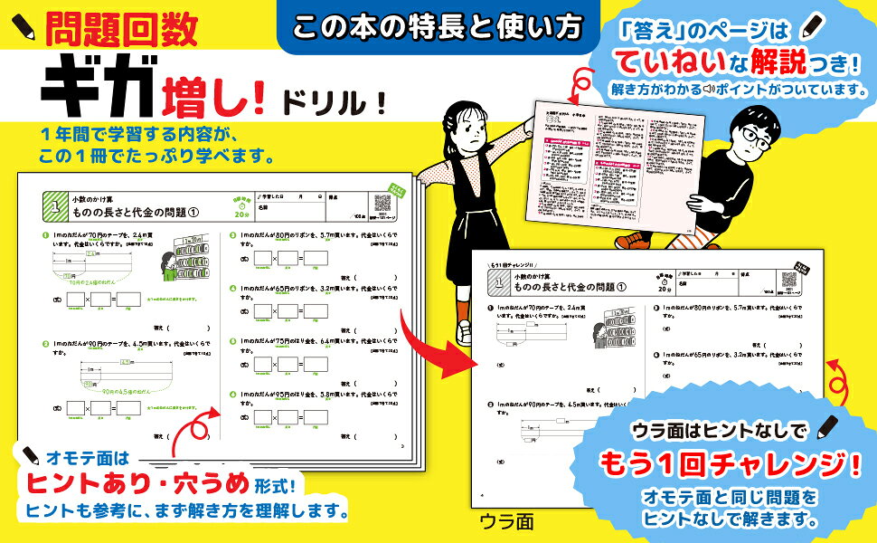 まずは表面の「ヒントつきの穴埋め問題」で解き方を理解!同じ問題を裏面の「ヒントなし」でチャレンジすることで、しっかりと力がつきます。問題を解く力だけでなく、読解力&思考力アップにも繋がります。
