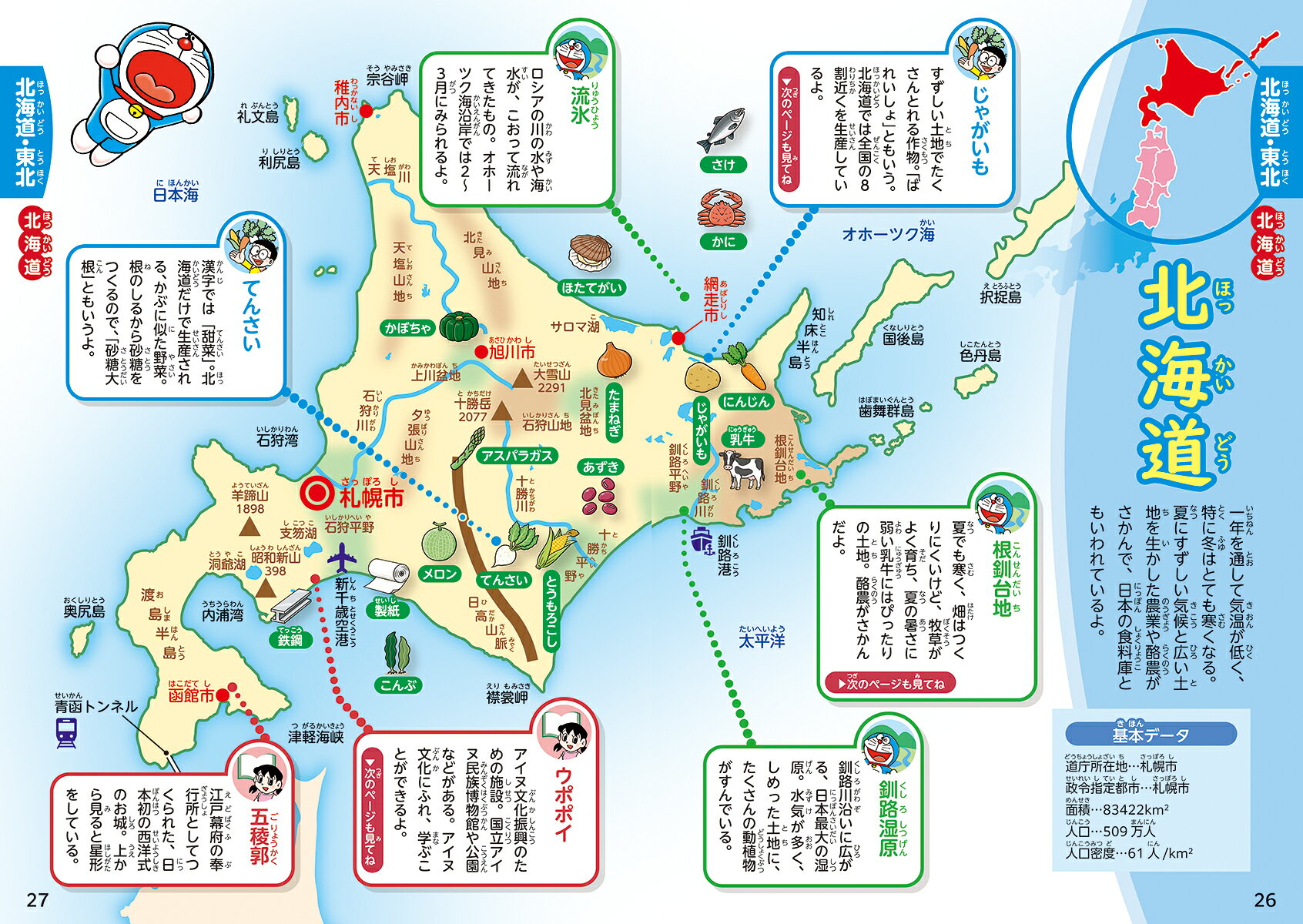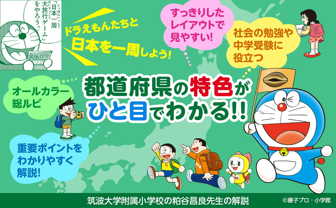 日本の地理、都道府県の特色がひと目でわかる!ドラえもんたちと一緒に、すごろくクイズで日本一周。社会科の授業や中学受験に役立つ。すっきりしたレイアウトで見やすい!重要ポイントをわかりやすく解説!