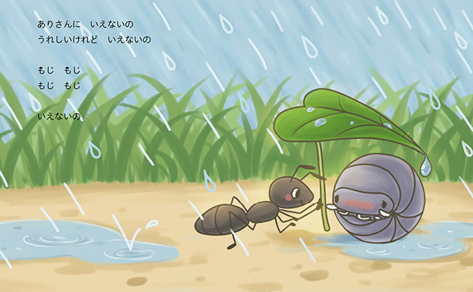 野原にすむダンゴムシ、カナブン、テントウムシ、バッタは、親切にしてくれたアリさんに、お礼を言いたいと思いました。でも、すぐに「ありがとう」と、言葉にすることができず、もじもじしてしまいます。
