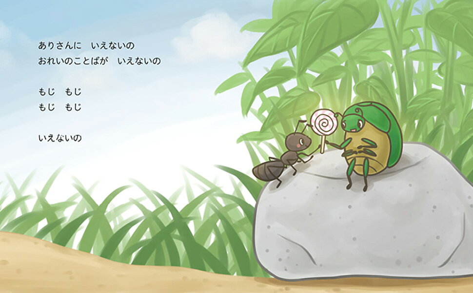 野原にすむダンゴムシ、カナブン、テントウムシ、バッタは、親切にしてくれたアリさんに、お礼を言いたいと思いました。でも、すぐに「ありがとう」と、言葉にすることができず、もじもじしてしまいます。 文章を書かれた内田麟太郎さんのお孫さんは、自分の気持ちを伝えるのが苦手で、急かされたり、あわてたりすると、ますます言葉が出なくなっていたそう。この作品は、お孫さんと同じような悩みを持つ子どもたちを想って書かれました。「あせらずゆっくりでいいんだよ」ということを、お話を通して優しく語りかけます。