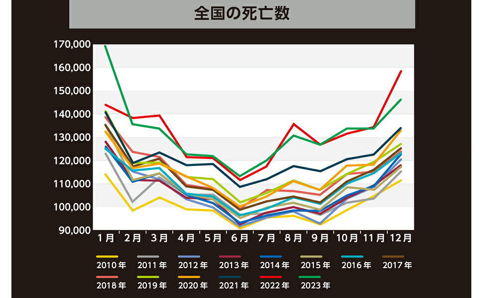 最近、あなたの身近で亡くなった方はいませんか? 日本は世界でもっとも高齢化が進んでいるので、残念ながら毎年たくさんの死亡者がでます。しかし長く闘病されていた方だけでなく、元気だったのに急に重い病気になって亡くなった方や、循環器系の病気、脳出血などで急死された方が多くありませんか? さらに有名人でも「この人、まだ若いのに亡くなったんだな」という人が目立ちませんか? 実は2022年以降、日本では毎年、説明がつかないほど多くの命が失われる国になっているのです。