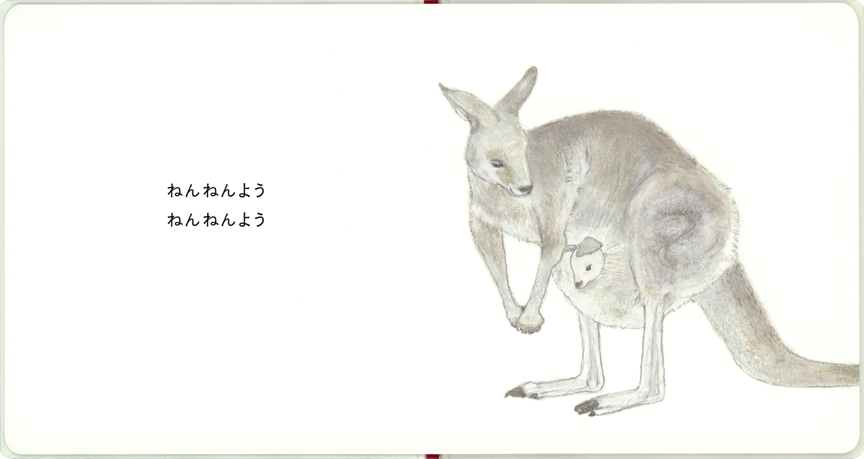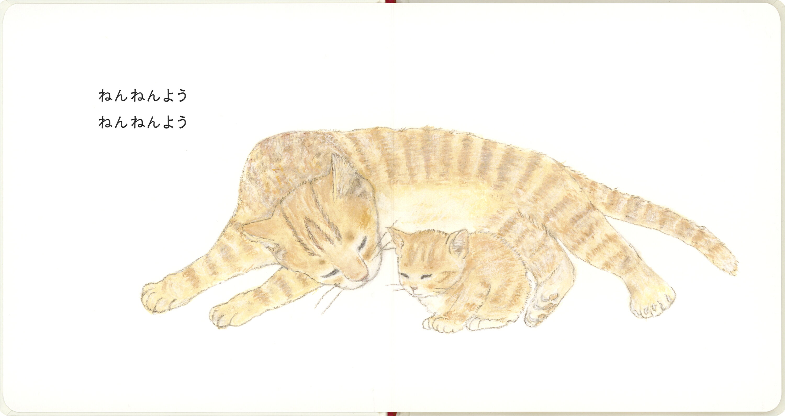 「ねんねんよう ねんねんよう」。ねこのお母さんが赤ちゃんに優しく声をかけます。「ねこのあかちゃんは かあさんに だかれて ころりん ねんねんよう」。カンガルーもペンギンも、りすもくまも、赤ちゃんはみんな、お母さんの「ねんねんよう」の声に安らかに眠ります。