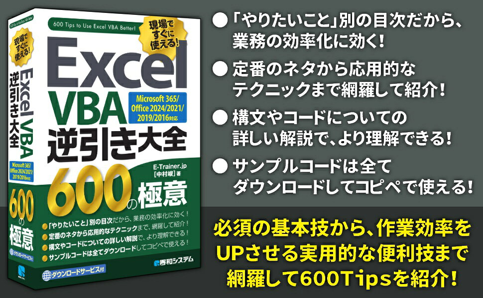 ![ExcelVBA逆引き大全600の極意Microsoft365/Office2024/2021/2019/2016対応[E-Trainer.jp[中村峻]]](https://tshop.r10s.jp/book/cabinet/4672/9784798074672_1_8.jpg)