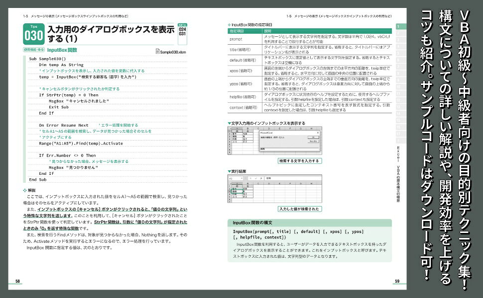 「やりたいこと」別の目次だから、業務の効率化に効く!定番のネタから応用的なテクニックまで、網羅して紹介!構文やコードについての詳しい解説で、より理解できる!サンプルコードは全てダウンロードしてコピペで使える!