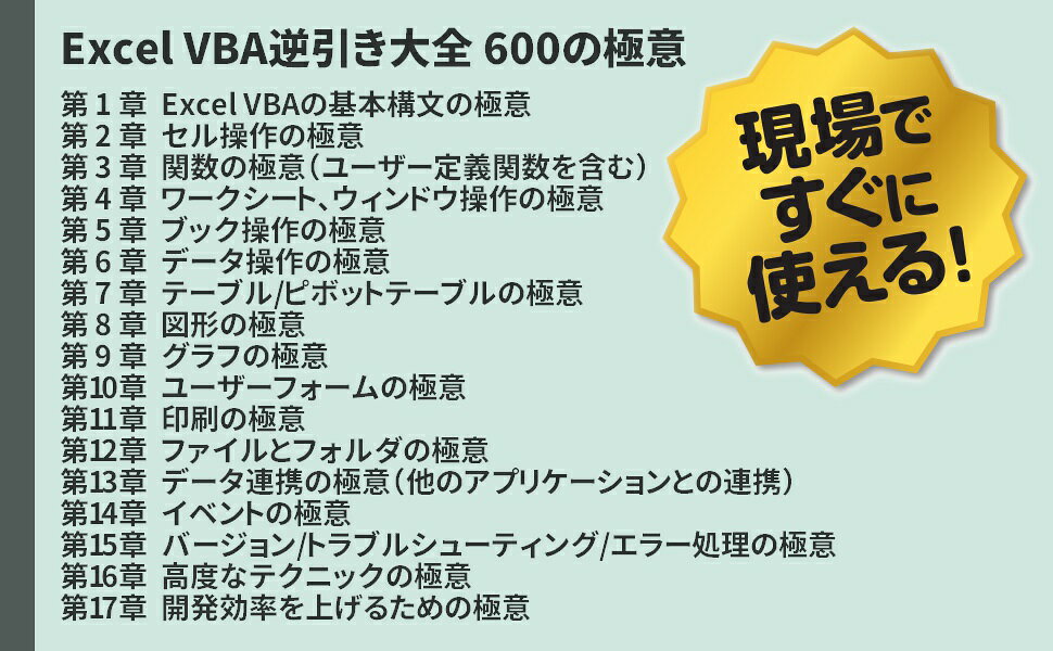 第1章 Excel VBAの基本構文の極意/第2章 セル操作の極意/第3章 関数の極意(ユーザー定義関数を含む)/第4章 ワークシート、ウィンドウ操作の極意/第5章 ブック操作の極意/第6章 データ操作の極意/第7章 テーブル/ピボットテーブルの極意/第8章 図形の極意/第9章 グラフの極意/第10章 ユーザーフォームの極意/第11章 印刷の極意/第12章 ファイルとフォルダの極意/第13章 データ連携の極意(他のアプリケーションとの連携)/第14章 イベントの極意/第15章 バージョン/トラブルシューティング/エラー処理の極意/第16章 高度なテクニックの極意/第17章 開発効率を上げるための極意