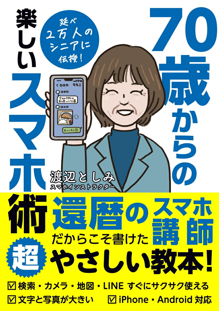 還暦のスマホ講師だからこそ書けた超やさしい教本!検索・カメラ・地図・LINE すぐにサクサク使える。文字と写真が大きい。iPhone・Android対応。