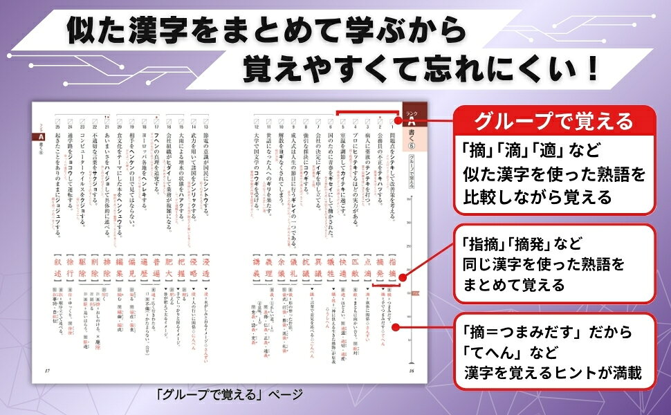 「グループで覚える」では、同じ漢字を使った熟語や、似た漢字を使った熟語などをまとめて掲載。比較しながら学習することで、記憶に定着しやすくなります。