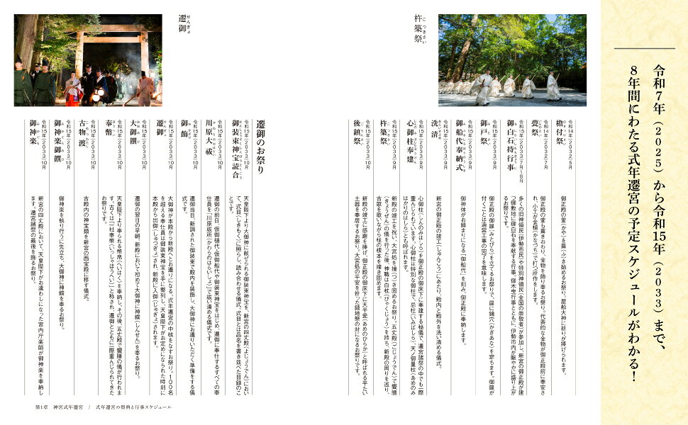第1章 神宮式年遷宮(御遷宮の撮影/式年遷宮とは?/式年遷宮の祭典と行事スケジュール ほか)/第2章 式年遷宮のお祭り(御用材のお祭り/造営のお祭り/遷御のお祭り ほか)/第3章 御遷宮と私(御遷宮と私/御遷宮と写真家/おはらい町とおかげ横丁 ほか)
