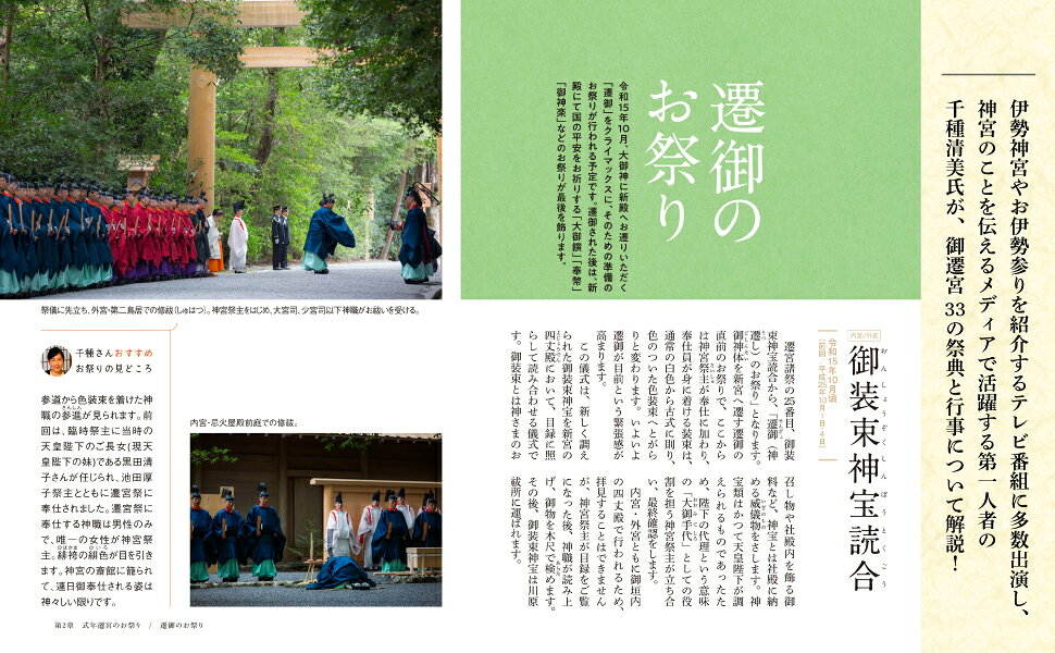 長年、神宮を追い続けている写真家のKankan氏が、前回の式年遷宮で撮影した秘蔵写真を公開。また、伊勢神宮やお伊勢参りを紹介するテレビ番組に多数出演し、神宮のことを伝えるメディアで活躍する第一人者の千種清美氏が、御遷宮33の祭典と行事について解説します。