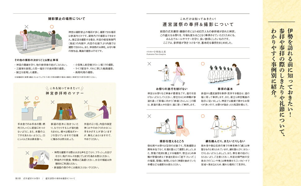 令和7年(2025)から令和15年(2033)まで、8年間にわたる式年遷宮の予定スケジュールも掲載。知られざる「別宮の御遷宮」では他では見られない豊富な写真を掲載する他、さらに知っておきたい参拝や奉拝の際のしきたりや礼節についても、わかりやすく事例別にまとめました。