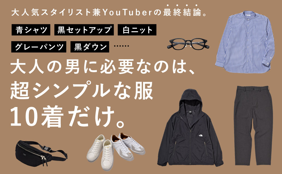 青シャツ 黒セットアップ 白ニット グレーパンツ 黒ダウン…大人の男に必要なのは、超シンプルな服10着だけ。春夏秋冬、手早く・手堅く“75点のおしゃれ”を目指す!たった10着で好印象は作れる!大人気スタイリスト兼YouTuberの最終結論。私服なんかにお金も時間もアタマも使いたくない男性、必読!