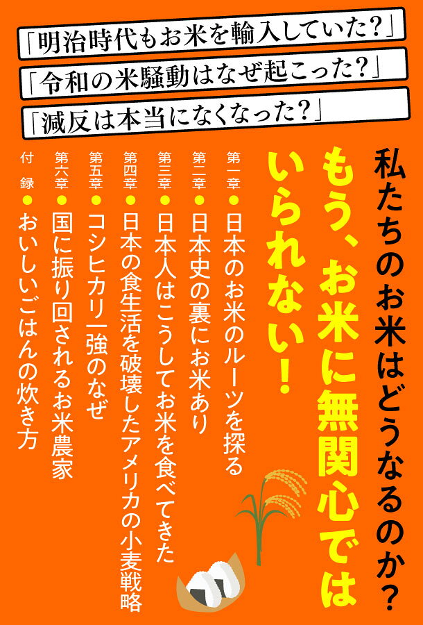 第一章 日本のお米のルーツを探る/第二章 日本史の裏にお米あり/第三章 日本人はこうしてお米を食べてきた/第四章 日本の食生活を破壊したアメリカの小麦戦略/第五章 コシヒカリ一強のなぜ/第六章 国に振り回されるお米農家/付録 おいしいごはんの炊き方