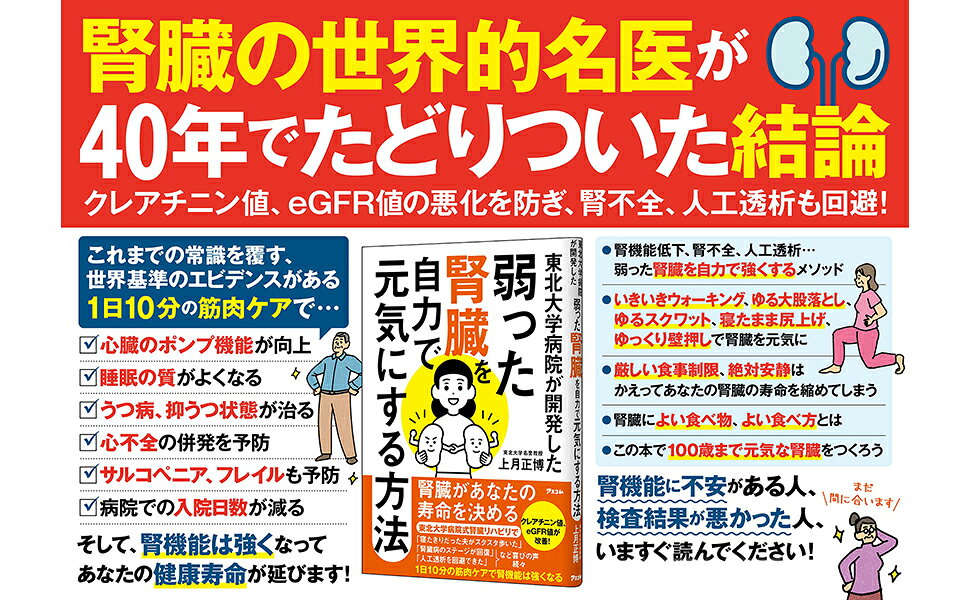 あなたの腎臓は悲鳴をあげていませんか?腎臓はよくならないと諦めている人、人工透析が心配な人、そして、「腎臓に不安」を抱えるすべての人にいまからでも、腎臓寿命は延ばすことはできます。しっかり結果がでる!「自力」で改善できる!×安静にする。×厳しい食事制限。これまでの常識を覆す、世界基準のエビデンスでクレアチニン値、eGFR値の悪化を防ぎ、腎不全、人工透析も回避!腎臓の世界的名医が40年でたどりついた結論。