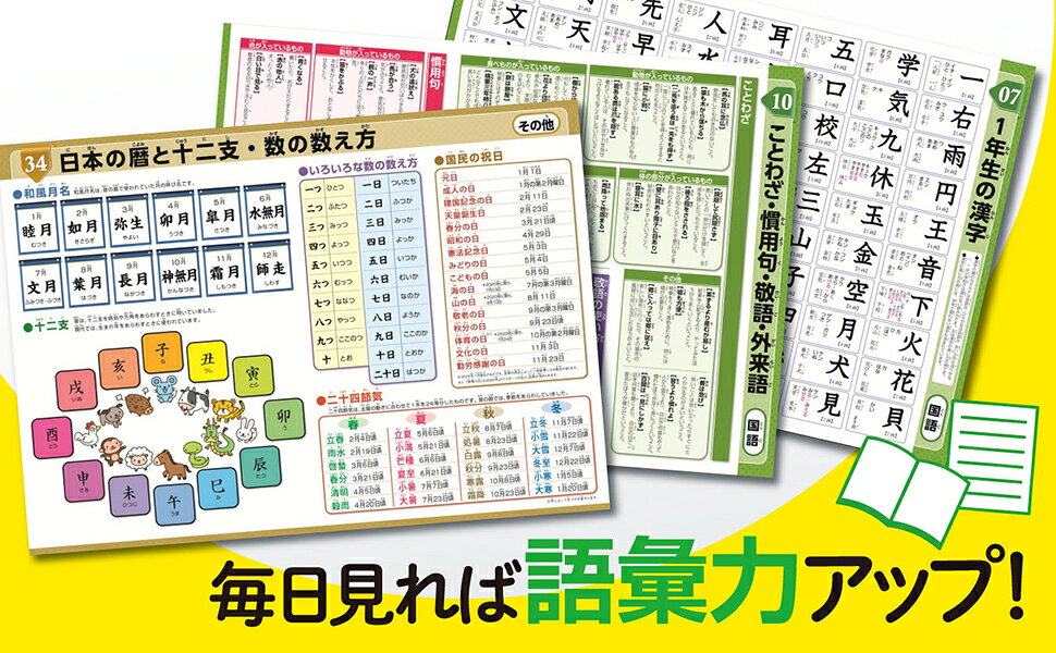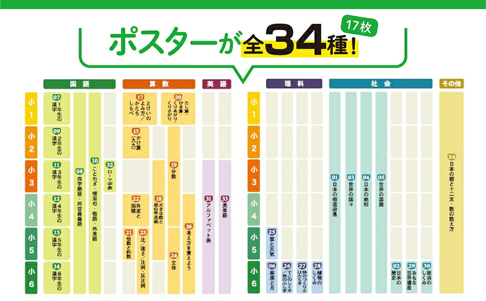 小学校1〜6年までの必須項目34種類(17枚) がポスターに!