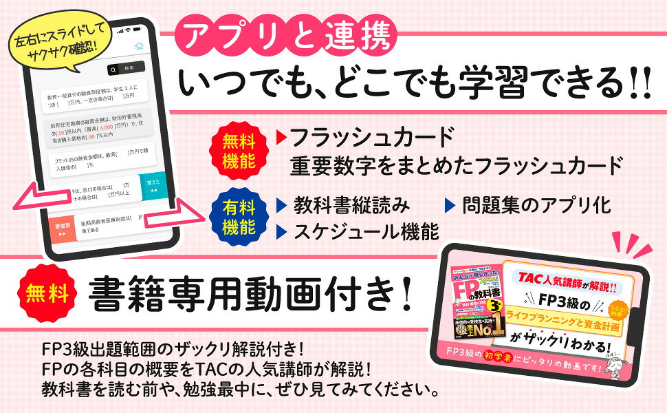 本書は、スマホ学習に対応しています。スマホアプリを活用すれば、重要ポイントをいつでも・どこでもチェックできるので、外出先でもスキマ時間をフル活用して学習することができます。
