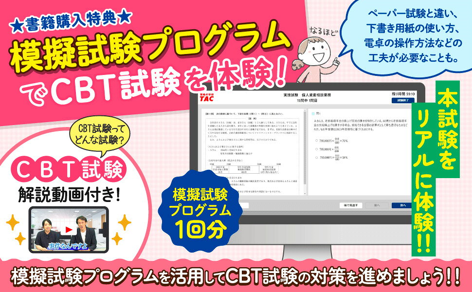 2024年からはじまったCBT方式(試験会場でPCにて解答する方式)でも安心して試験に臨んでいただくために、本番そっくりの模擬試験プログラムが付属しています。