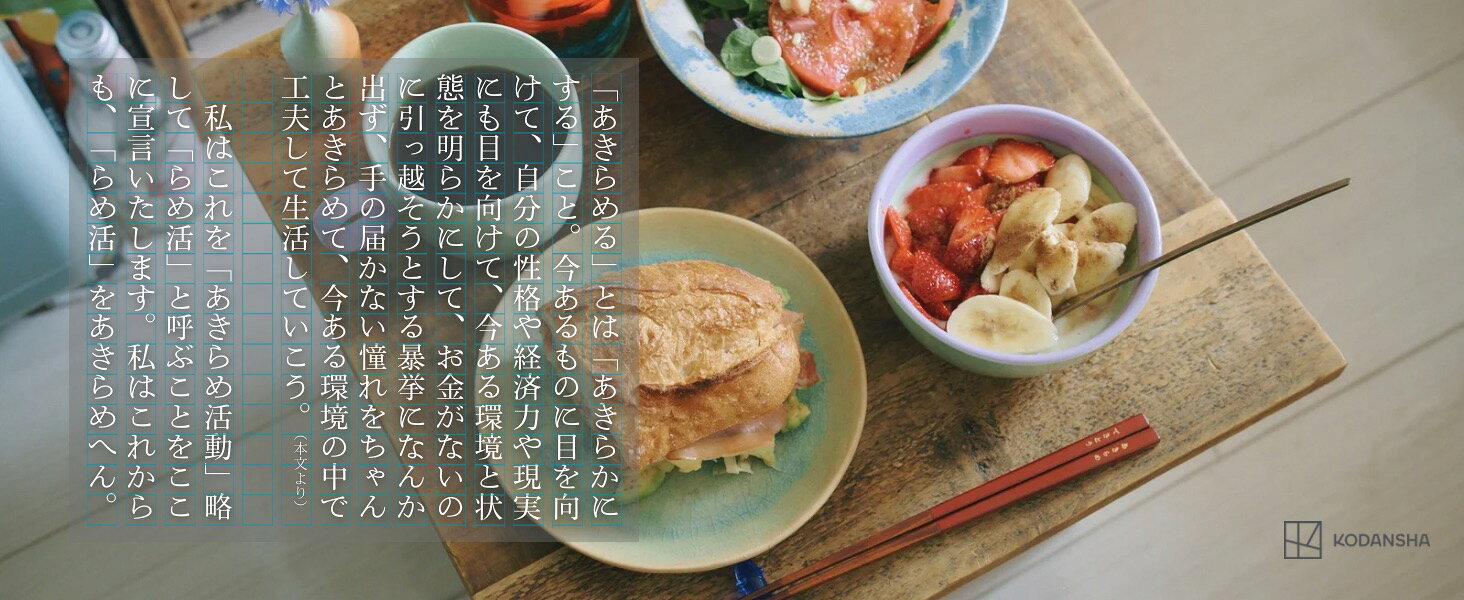 ーー「諦める」とは「明らかにする」こと。今あるものに目を向けて、自分の性格や経済力や現実にも目を向けて、今ある環境と状態を明らかにして、お金がないのに引っ越そうとする暴挙になんか出ず、手の届かない憧れをちゃんとあきらめて、今ある環境の中で工夫して生活していこう。私はこれを「あきらめ活動」略して「らめ活」と呼ぶことをここに宣言いたします。私はこれからも、「らめ活」をあきらめへん。