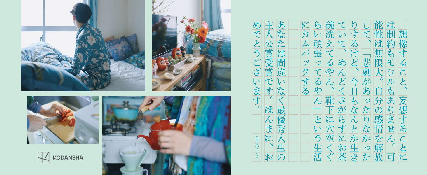ーー想像すること、妄想することには制約もモラルもありません。可能性は無限大。自分の感情を解放して、悲劇があったりなかったりするけど、今日もなんとか生きていて、めんどくさがらずにお茶碗洗えてるやん、靴下に穴空くぐらい頑張ってるやんという生活にカムバックするあなたは間違いなく最優秀人生の主人公賞受賞です。