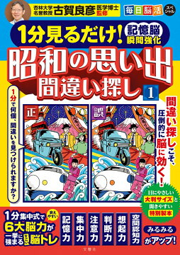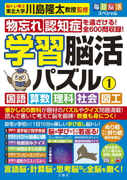 | 内容 | 初めての脳活ドリルにオススメ! 優しい×易しい「やさしい脳活」シリーズが登場! 監修は脳トレ博士・東北大学 川島隆太教授。 ガイドは漢検1級・クイズ大好きな宮崎美子さん。 川島先生が脳活性化の効果を実証した脳ドリルと、 宮崎美子さんが出題したトリビアクイズを掲載! | 漢字の部首や書き順を問うもの、熟語を問うもの、見るだけでスッと解けるもの、じっくり時間をかけて徐々に答えを導き出すものなど、漢字好きにはたまらない多彩な問題ばかり! | 運転に必要な脳の働き(運転脳)を重点的に鍛錬する脳トレ問題を網羅。 さらに、シニアが陥りやすい運転の盲点に関する解説と認知機能検査の模擬テストを収録。 | 漢字系脳ドリル、計算系脳ドリル、言葉系脳ドリルなど、脳の前頭前野の血流を増やし、認知機能の向上に役立つことが確かめられたドリルが満載。 | 間違いを見つけた脳がひらめく! 懐かしい記憶で、脳がときめく! 心が温まる! 昔話に花が咲く! トリッキーな間違いであなたを悩ます良問・難問が全60問! 目にやさしい大判サイズと開きやすい特別製本 ぜひ一度ご体験ください。 | 物忘れ・認知症を遠ざける!全600問収録! 懐かしの5教科が題材のパズルやクイズ問題満載! 読んで書いて考えて脳を鍛練!教養も身につく!1日10分の楽しい学び直し脳トレ。 |