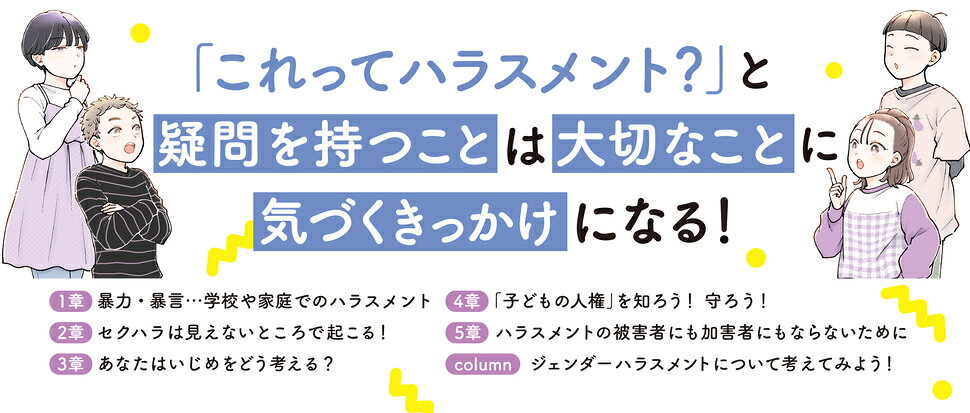 ハラスメントの基本知識/第1章 暴力・暴言…学校や家庭でのハラスメント/第2章 セクハラは見えないところで起こる!/第3章 あなたはいじめをどう考える?/第4章 「子どもの人権」を知ろう!守ろう!/第5章 ハラスメントの被害者にも加害者にもならないために/ジェンダーハラスメントについて考えてみよう!