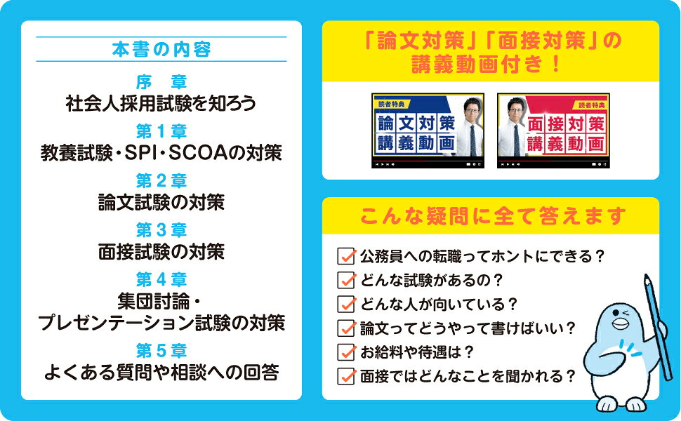 序章 社会人採用試験を知ろう/第1章 教養試験・SPI・SCOAの対策/第2章 論文試験の対策/第3章 面接試験の対策/第4章 集団討論・プレゼンテーション試験の対策/第5章 よくある質問や相談への回答