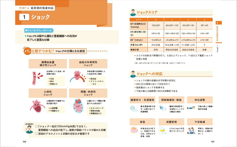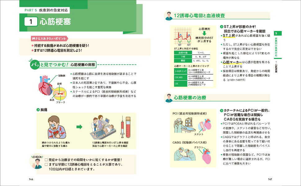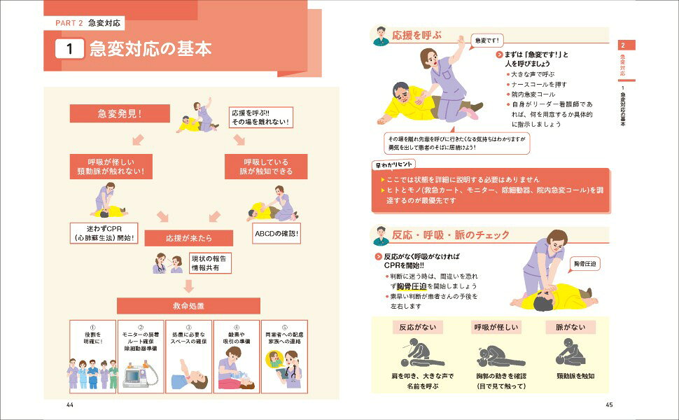 新人から3年目の看護師や看護学生に向けて、急変時に求められる基礎知識を、2ページごとのシンプルなレイアウトと豊富なイラストで、わかりやすく解説。「行動」と「根拠」の両面から、現場で役立つ対応力が身につきます。