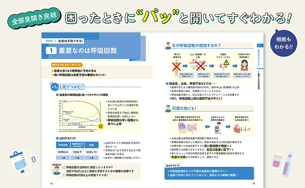 1 急変は予測できる!(重要なのは呼吸回数/急変予測ツール ほか)/2 急変対応(急変対応の基本/急変対応の流れ ほか)/3 救急カート薬剤(アドレナリン/アミオダロン塩酸塩 ほか)/4 症状別の急変対応(ショック/発熱 ほか)/5 疾患別の急変対応(心筋梗塞/肺血栓塞栓症 ほか)