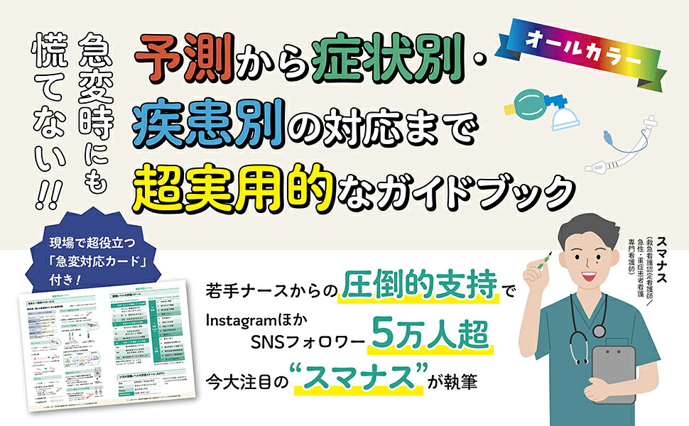 著者は救急認定看護師として3次救急ER・ICUで10年以上の経験を持ち、SNSで約5万人のフォロワーにリアルな現場情報を発信するスマナスさん。実際に新人〜若手看護師が「知りたいこと」「困っていること」を集めてつくった、即戦力になる一冊です。