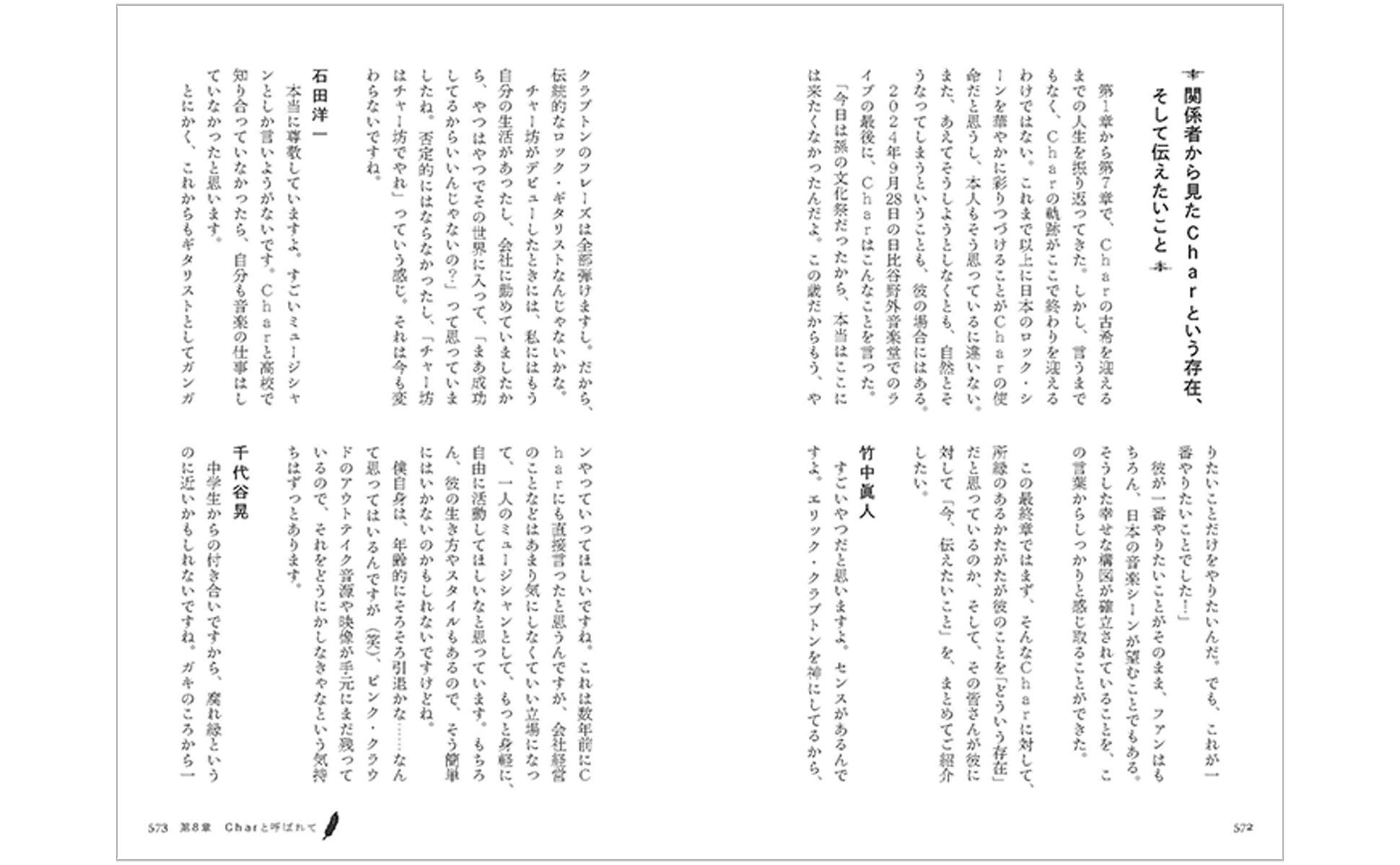 1976年「Navy Blue」でデビュー以来、常にギター・シーンの先頭を走り続け、今でも進化をやめない稀有なギタリスト、Char。2025年に古希(70歳)を迎えるのを記念して初めての評伝を刊行する。本人をみっちり取材するのはもちろんのこと、活動のタームごとに関わってきた重要な人物を多数取材し、Charにとっての"相対者"の発言と対比しながら、その実像を多面的に描いていく。取材対象者は、実兄の眞人、元マネージャーの長尾哲士、江戸屋代表の石田洋一、泉谷しげる、金子マリ、クリス・ペプラー、佐藤準、JESSE、トミー・スナイダー、仲井戸"CHABO"麗市、鳴瀬喜博、古田たかし、布袋寅泰、ミッキー吉野、山岸潤史、ロバート・ブリルなどなど。あらゆる歴史には当事者の数だけ視点があるが、それらを交えながら日本のロック史にCharという稀代のミュージシャンを位置付ける。これはよくある自伝でもモノローグでもなく、壮大なドキュメントである。