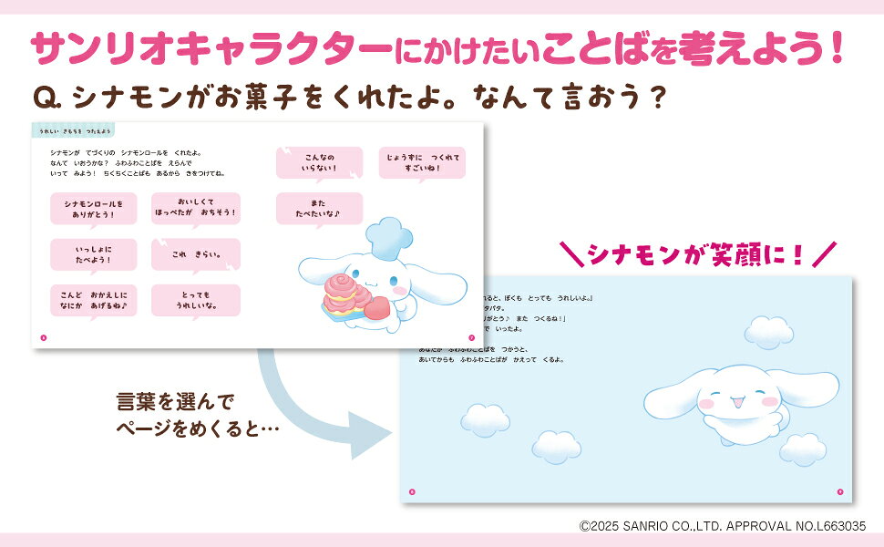 シナモンたちがよろこびそうな言葉を考えて、みんなをニコニコ笑顔にしちゃおう!毎日を楽しく過ごすための言葉遣いのヒントが詰まった一冊。友達作りや新学期準備、プレゼントにもおすすめです。