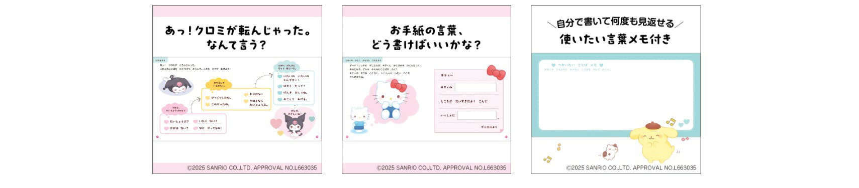 この絵本では、シナモン、ポムポムプリン、クロミ、マイメロディ、ハローキティと一緒に、言われた人がうれしくなる「ふわふわことば」と、悲しくなる「ちくちくことば」の違いを考えます。