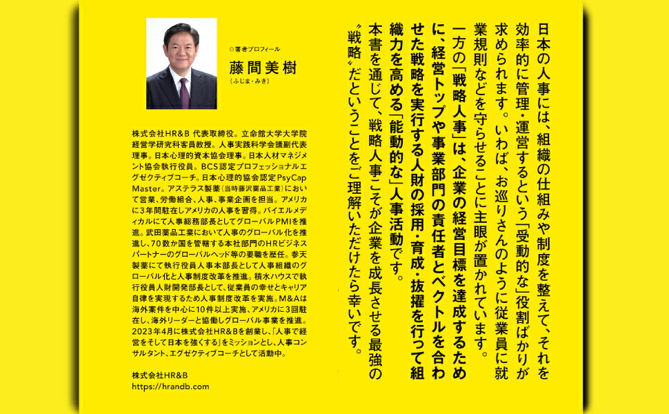 株式会社HR&B 代表取締役。立命館大学大学院経営学研究科客員教授。人事実践科学会議副代表理事。日本心理的資本協会理事。日本人材マネジメント協会執行役員。BCS認定プロフェッショナルエグゼクティブコーチ。日本心理的協会認定PsyCap Master。アステラス製薬(当時藤沢薬品工業)において営業、労働組合、人事、事業企画を担当。アメリカに3年間駐在しアメリカの人事を習得。バイエルメディカルにて人事総務部長としてグローバルPMIを推進。2023年4月に株式会社HR&Bを創業し、「人事で経営をそして日本を強くする」をミッションとし、人事コンサルタント、エグゼクティブコーチとして活動中(本データはこの書籍が刊行された当時に掲載されていたものです)