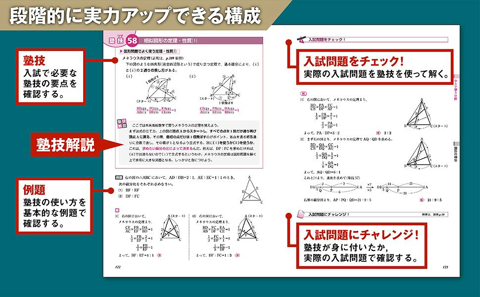 「塾技要点」→「塾技解説」→「入試問題をチェック!」→「入試問題にチャレンジ!」と、入試レベルまで段階的な学力の向上が可能です。