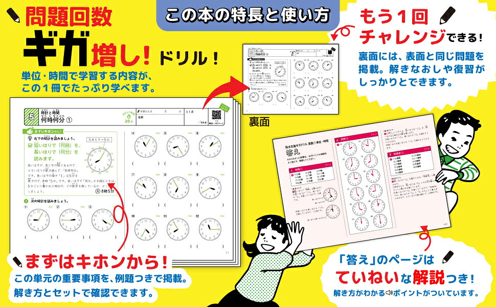小学生の算数の中でも重要な【単位(長さ・かさ・重さ)・時間(時計と時間)】の内容がこの1冊でたっぷり学べます。日常学習はもちろん、長期休暇や学年末の復習まで長いスパンで使える1冊です。