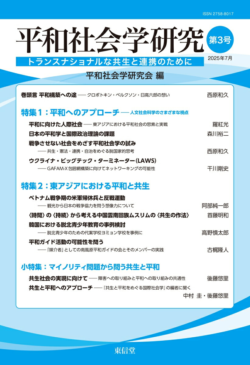 「トランスナショナルな共生と連携」をキーワードに、国家間の対立や分断が深まる現代において、暴力と支配の構造をいかに超えるかを探る。特集1では、平和社会学、国際政治、ビッグテックと戦争の関係などから、平和への多角的な実践アプローチを提示。特集2では、東アジアを舞台に、脱北青少年やムスリム、反戦運動や平和ガイドなど、地域に根ざした実践を通じて共生の可能性を追究する。時代に抗し、草の根からの平和構築を模索した気鋭の論集。