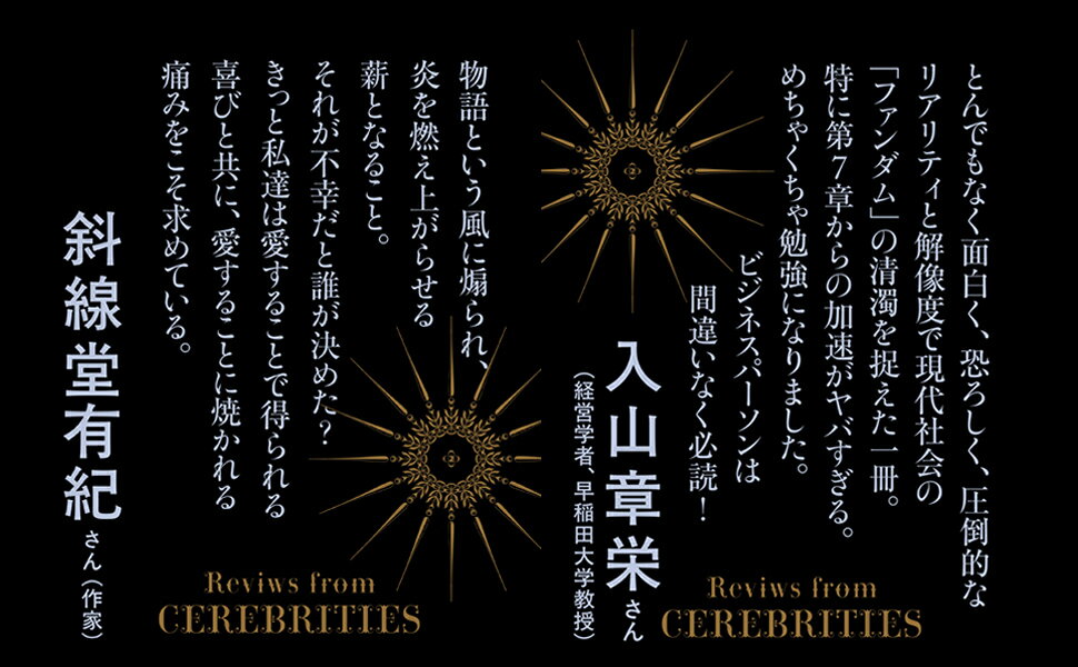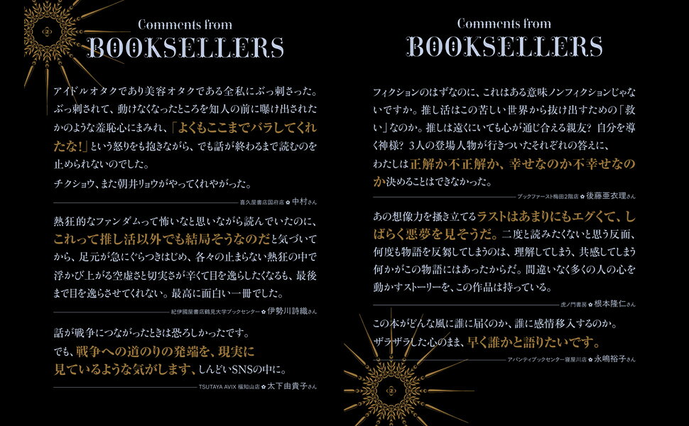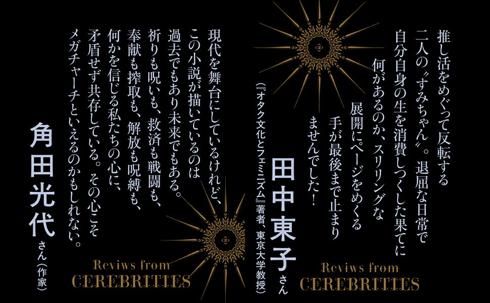 久保田慶彦(47)レコード会社勤務。とある能力を買われ、アイドルグループ運営に参画することに。武藤澄香(19)留学を志す大学生。内向的な気質に悩むうち、一人のアイドルに出会う。隈川絢子(35)契約社員。舞台俳優を熱烈に応援中だが、ある報道で状況が一変する。ファンダム経済を築く者、のめり込む者、のめり込んでいた者…三者三様の視点で浮かび上がる、人間の心を動かす“物語”の功罪。