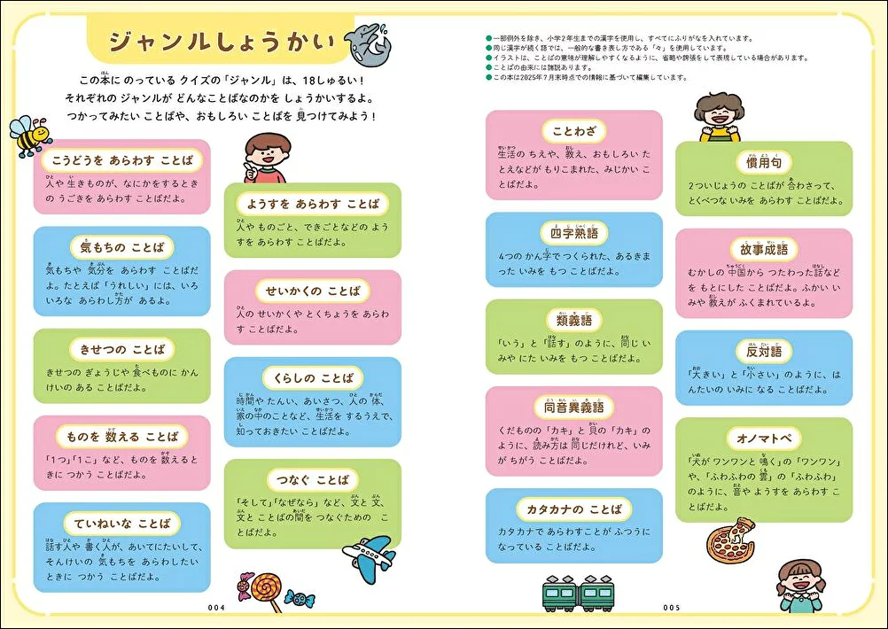ことわざ/慣用句/四字熟語/オノマトペ/敬語/気もちのことば/季節のことば/類義語/反対語など、全18ジャンル。5歳〜小学校低学年向け。